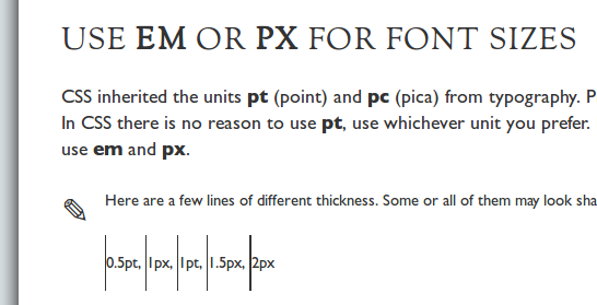 ies are kinda bummed but I think I see the point. The point being: a pixel is now considered whatever the hell a pixel is, and points, picas and inches are only accurate in print media, not screen media. This is because the computer manufacturers out there are not interested in providing a worthwhile mapping from points to pixes because dots per inch and pixels per dot are actually not related. You can have three dots per pixel now, or three pixels per dot. Whatever the fuggin’ hell that means. So they want all our font sizes specified in pixels.