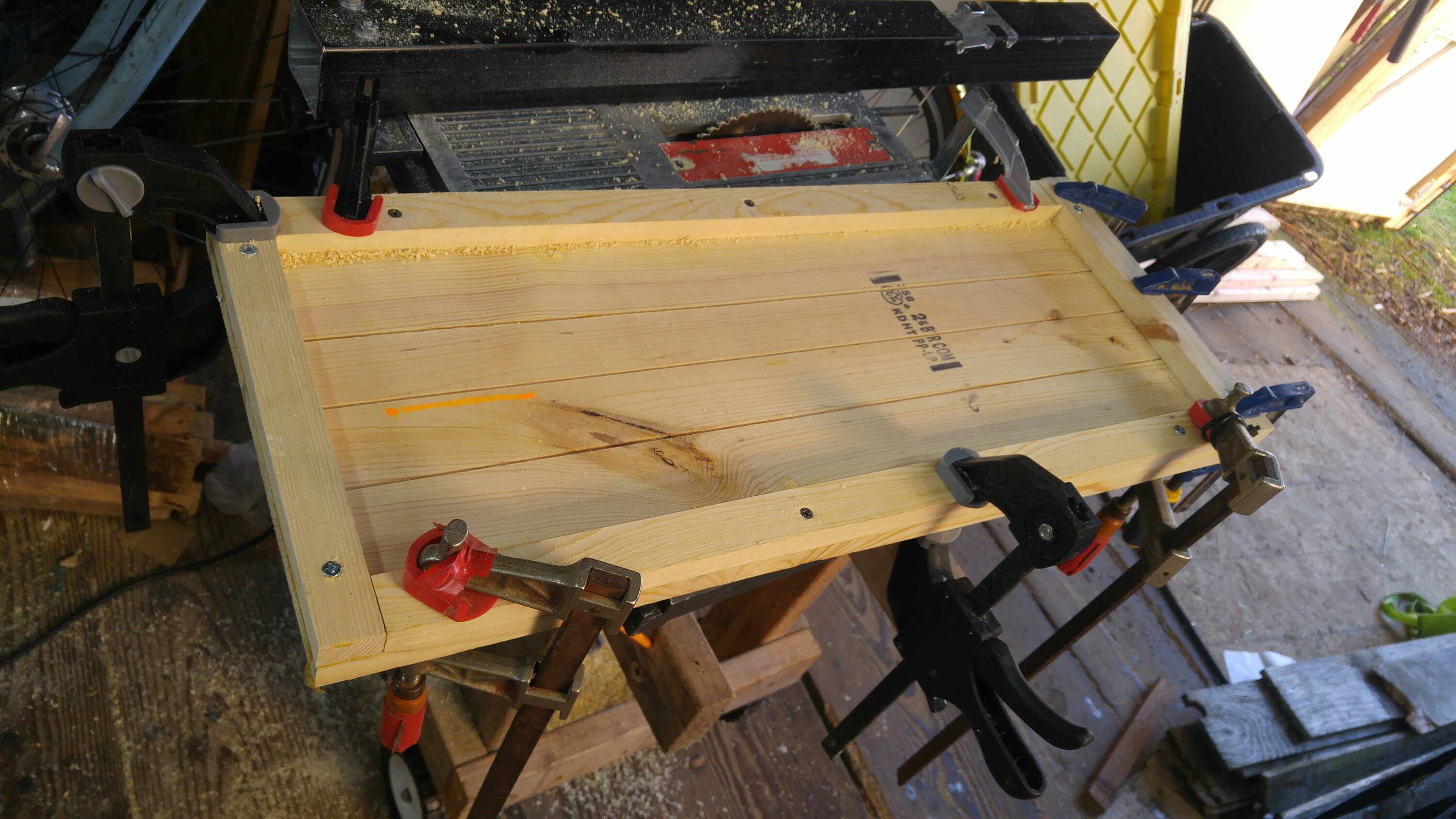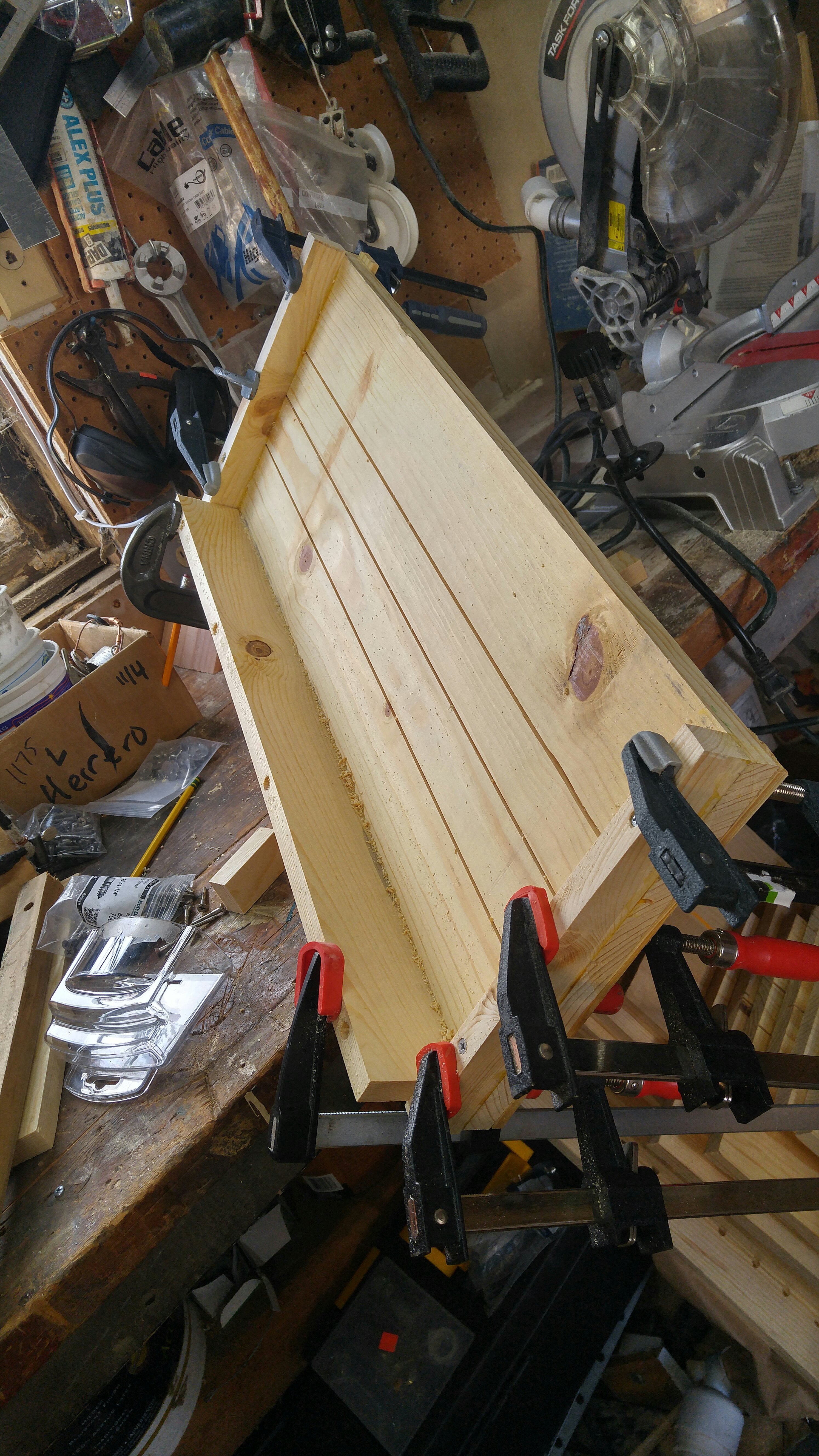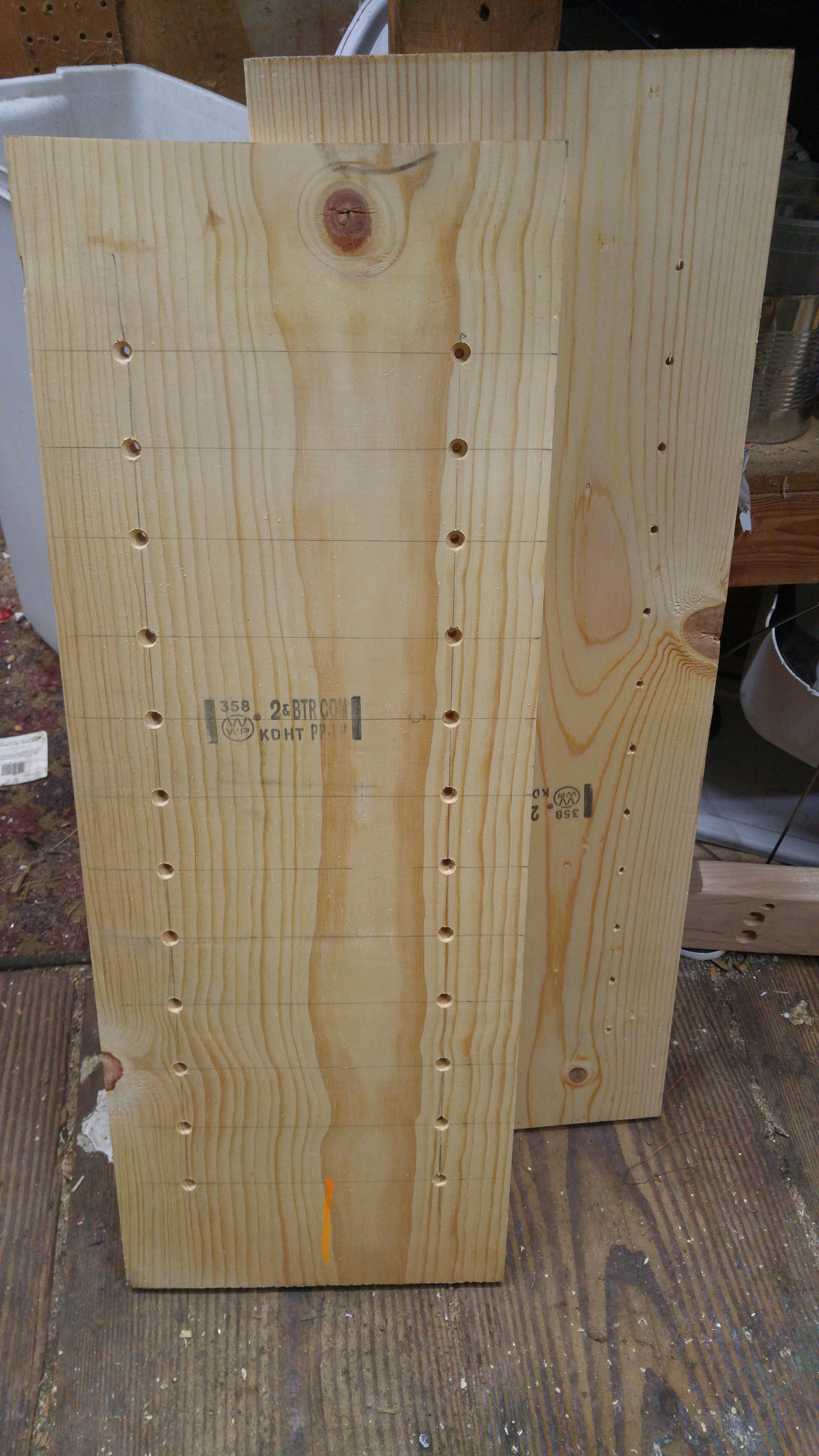By the time I started using the 1×12 planks fir the bookcase shelves, I noticed significantly more bowing in a few of the boards than when I bought them. I’m trying to help flex them flat by doing kerf cuts about half the depth of the boards on the convex side so I can glue and screw them back to flat when I assemble them.